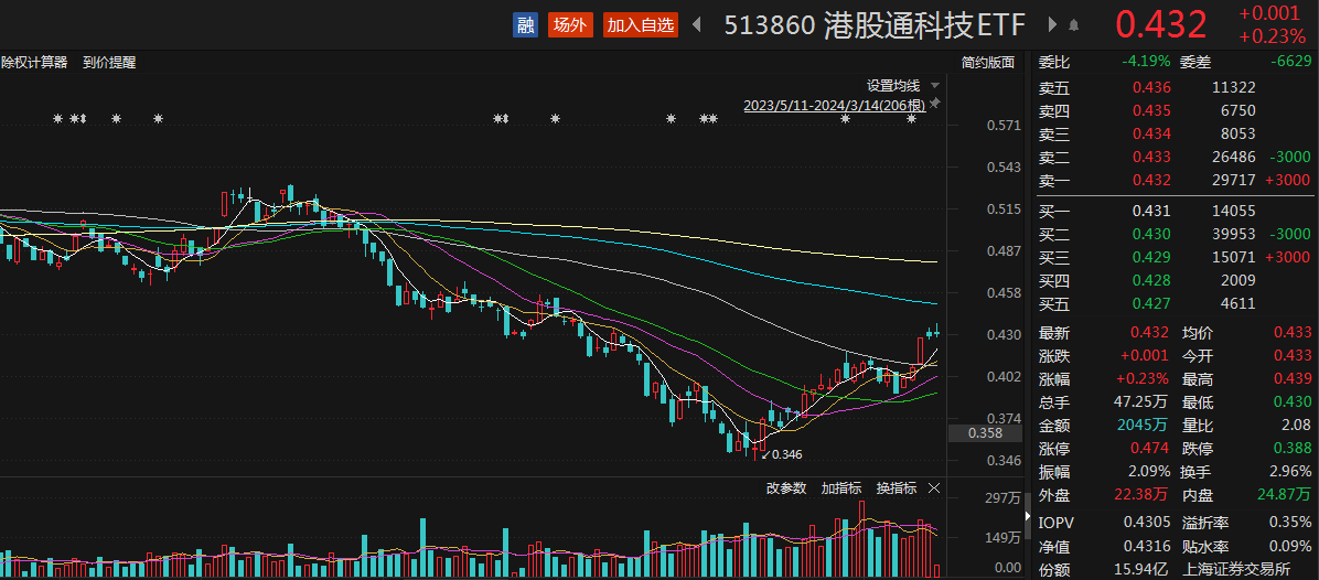 港股通科技ETF(513860)高开,盘中一度涨近2%,盘中走弱震荡,现涨0.23%,成交额突破2000万元,换手率2.96%,盘中溢价,溢折率0.35%。
