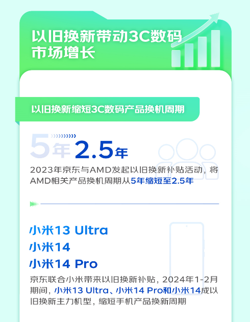 近年来,以手机产品为代表的智能硬件换机周期不断延长。但以旧换新的大力推广,将为这一现状带来新的破局。《报告》显示,2023年AMD携手京东带来以旧换新补贴,以更实惠的价格吸引上万名用户参与焕新,AMD的相关产品换机周期从5年缩短到2.5年。小米品牌也联合京东积极推动以旧换新,2024年1-2月期间小米13 Ultra、小米14 Pro和小米14成为用户以旧换新的主力机型,极大缩短了手机产品的换新周期,有效带动销售增长。