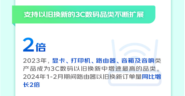 除了用以旧换新的方式买手机、买电脑,如今消费者还可以有更多选择。《报告》显示,2023年显卡、打印机、路由器、音箱及音响产品成为京东3C数码以旧换新增速最高的品类,尤其以路由器品类增长最为显著,2024年1-2月期间,京东所售路由器以旧换新订单量同比增长2倍,各品牌的路由器产品均迎来销量高峰。