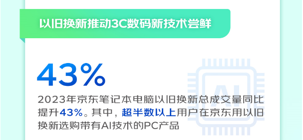 在以旧换新加速换机周期、为品牌创造增量的同时,也让更多品牌加大技术创新投入、更迭新产品。在当前AI技术快速发展的过程中,越来越多厂商也加大对AI技术的研发资源投入,带来AI平板电脑、AI笔记本电脑等创新产品,为消费者带来最新的科技体验。《报告》显示,2023年京东笔记本电脑以旧换新总成交量同比提升43%,其中,随着上游芯片厂商全面更新AI技术后,超半数以上用户在京东用以旧换新购入带有AI技术的PC产品,让新产品销量得到快速提升。以英特尔专为移动PC打造的第一代酷睿Ultra处理器为例,这款AI处理器能实现高能效的AI加速和本地推理,让用户体验更高效的文生文、文生图、图生图等场景,随时随地进行AI办公、AI创作,率先开启AI PC新时代。在酷睿Ultra新品首发关键期,京东携手英特尔将以旧换新补贴作为重要发力点,为消费者提供了一个省钱又省心的购机方式,受到用户好评。