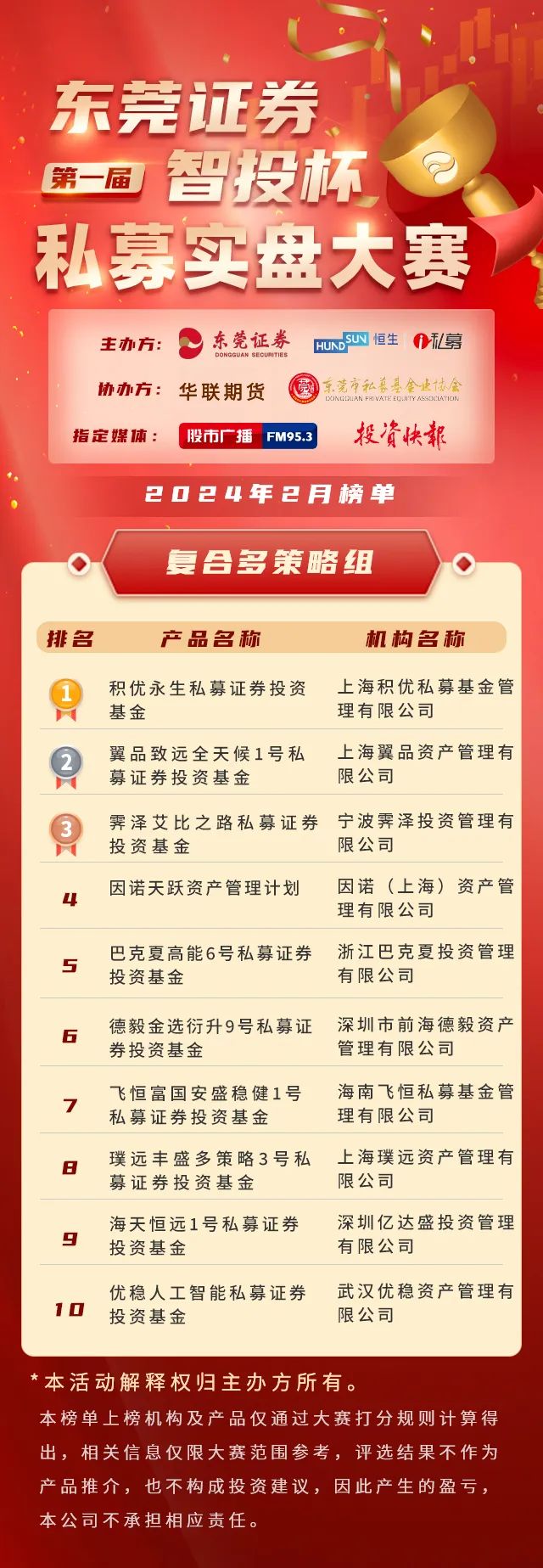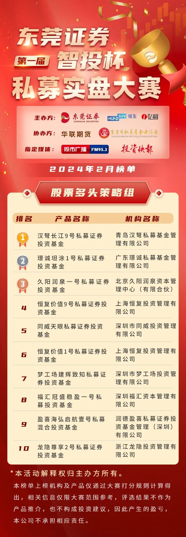 东莞证券第一届“ 智投杯”私募实盘大赛火热进行中,本次大赛由东莞证券、恒生i私募主办,华联期货、东莞市私募基金业协会协办,股市广播及投资快报作为指定媒体。报名以来吸引超600家私募机构、1400余只产品参赛。
