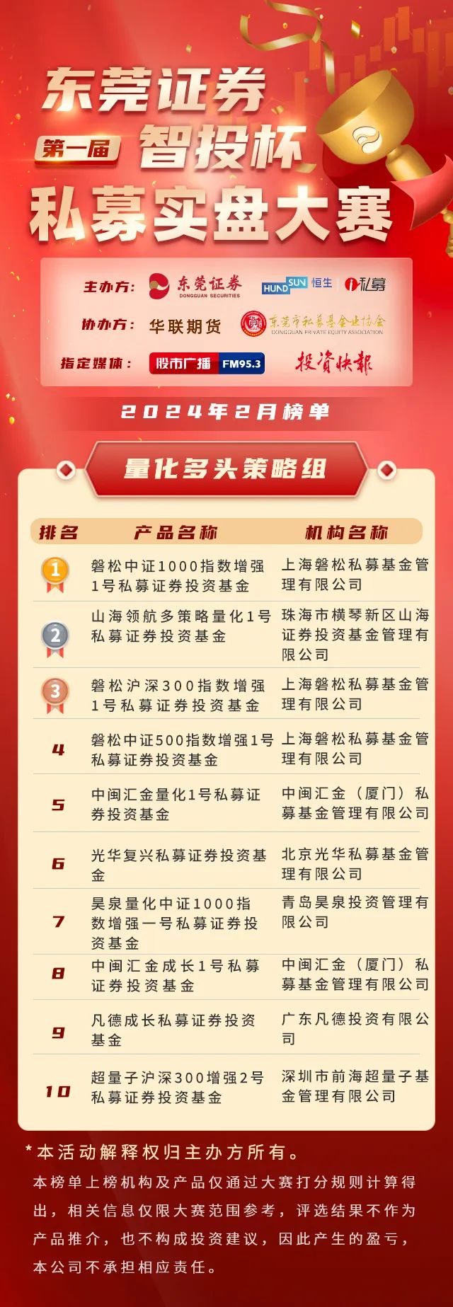 量化多头策略组2月榜单的冠军由上海磐松私募基金管理有限公司的磐松中证1000指数增强1号私募证券投资基金获得。亚军季军分别为珠海市横琴新区山海证券投资的山海领航多策略量化1号和上海磐松私募的磐松沪深300指数增强1号。