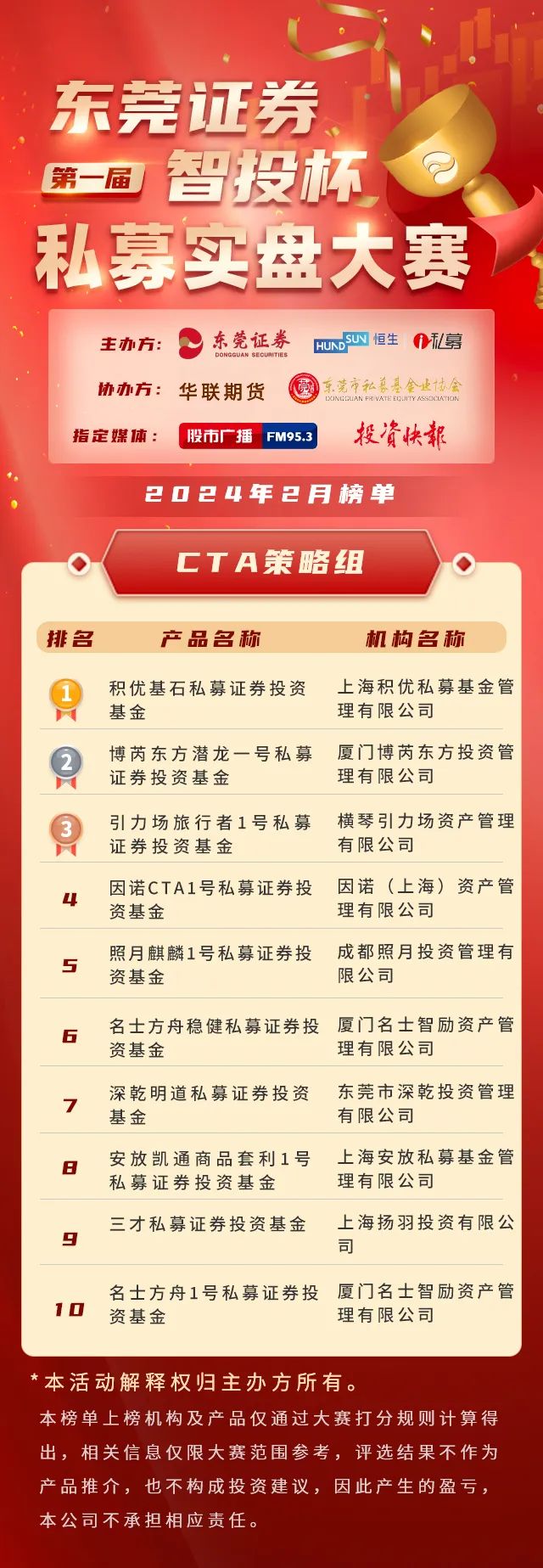 CTA策略组2月榜单的冠军由上海积优私募基金管理有限公司的积优基石私募证券投资基金获得。亚军季军分别是厦门博芮东方投资的博芮东方潜龙一号和横琴引力场资产的引力场旅行者1号。