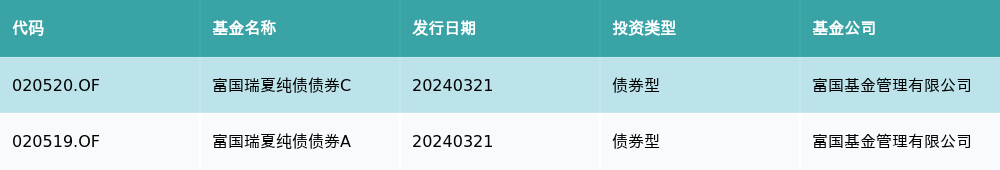 3月21日有2只新基金发行,分别为:富国瑞夏纯债债券C、富国瑞夏纯债债券A,详情见下表: