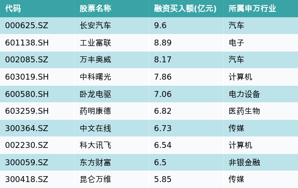 3月21日,两市共有3339只个股有融资资金买入,其中长安汽车、工业富联、万丰奥威排名前三,买入金额分别9.6亿元、8.89亿元、8.17亿元。融资买入额前10个股详情见下表:
