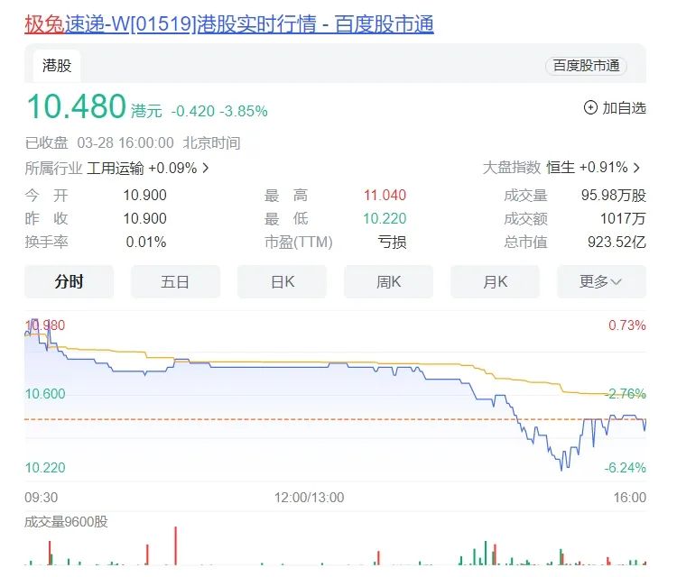 极兔的交易量也十分惨淡。3月28日,极兔交易量为95.98万股,换手率仅为0.01%。