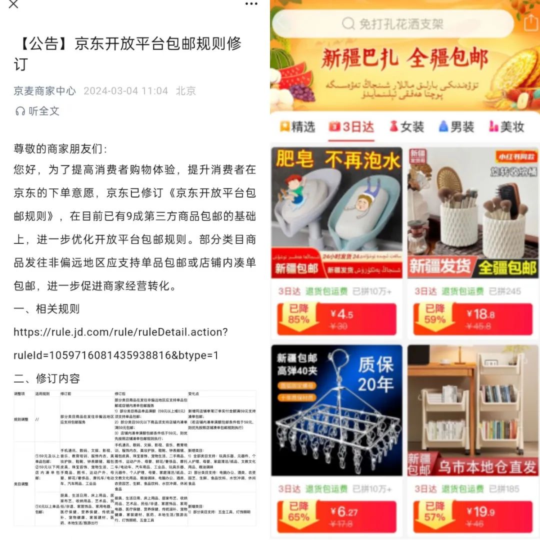 图:京东优化59元包邮,拼多多升级新疆包邮