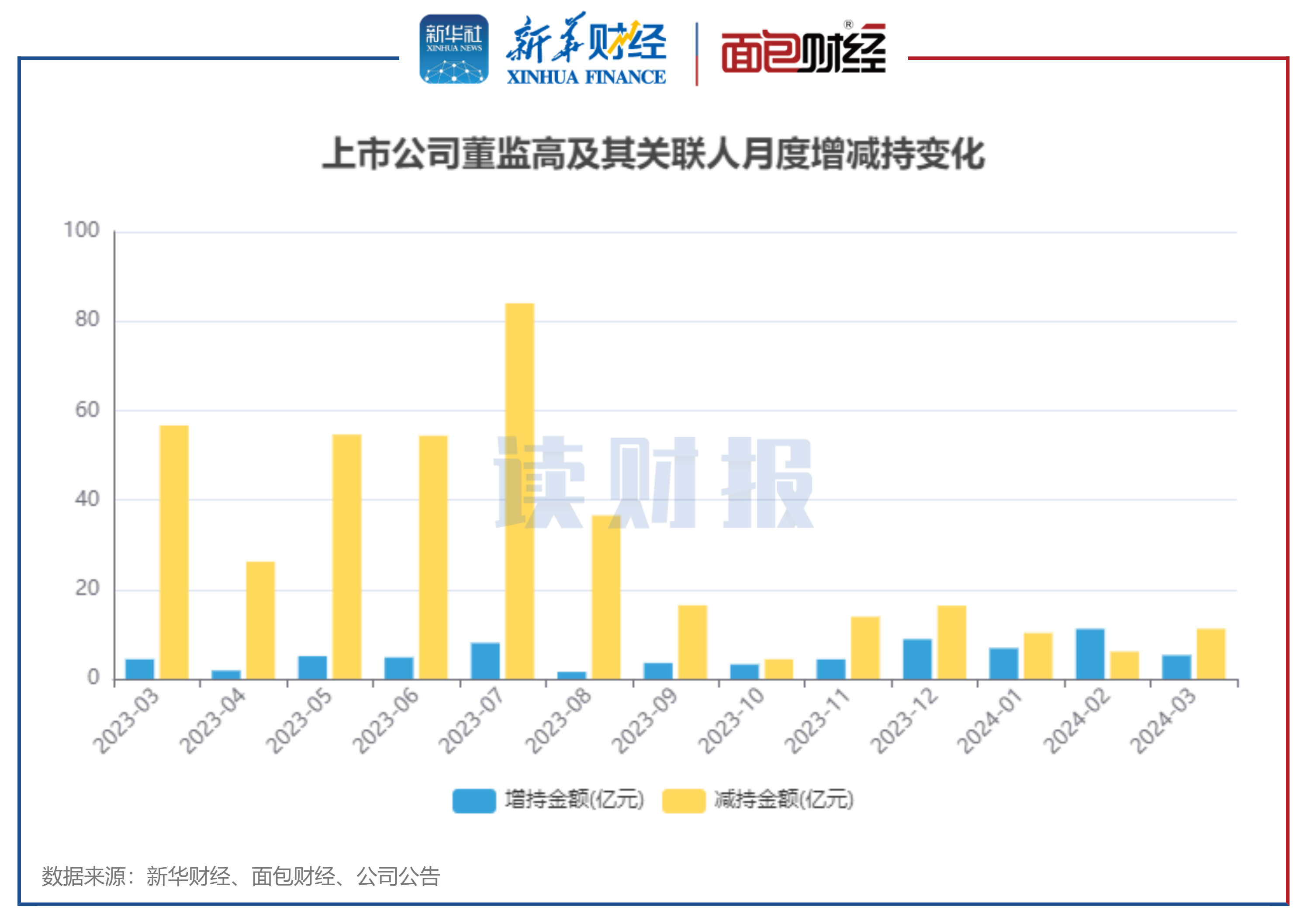 新华财经和面包财经研究员根据上市公司的信披数据统计,2024年3月,沪深两市上市公司董监高及其关联人减持金额合计约11.21亿元,涉及37家公司;增持金额合计约5.28亿元,涉及101家公司。增、减持金额相抵之后,净减持金额5.93亿元。