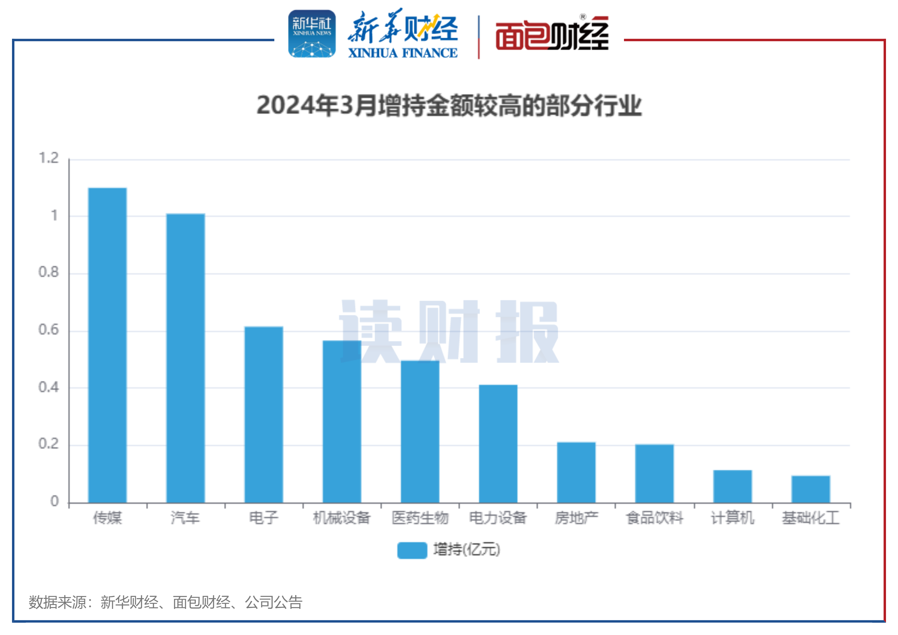 从行业来看,3月份传媒行业的增持金额排在首位,约为1.1亿元;汽车行业增持金额排在第二,约为1.01亿元;电子行业增持金额也在前列,约为0.61亿元。