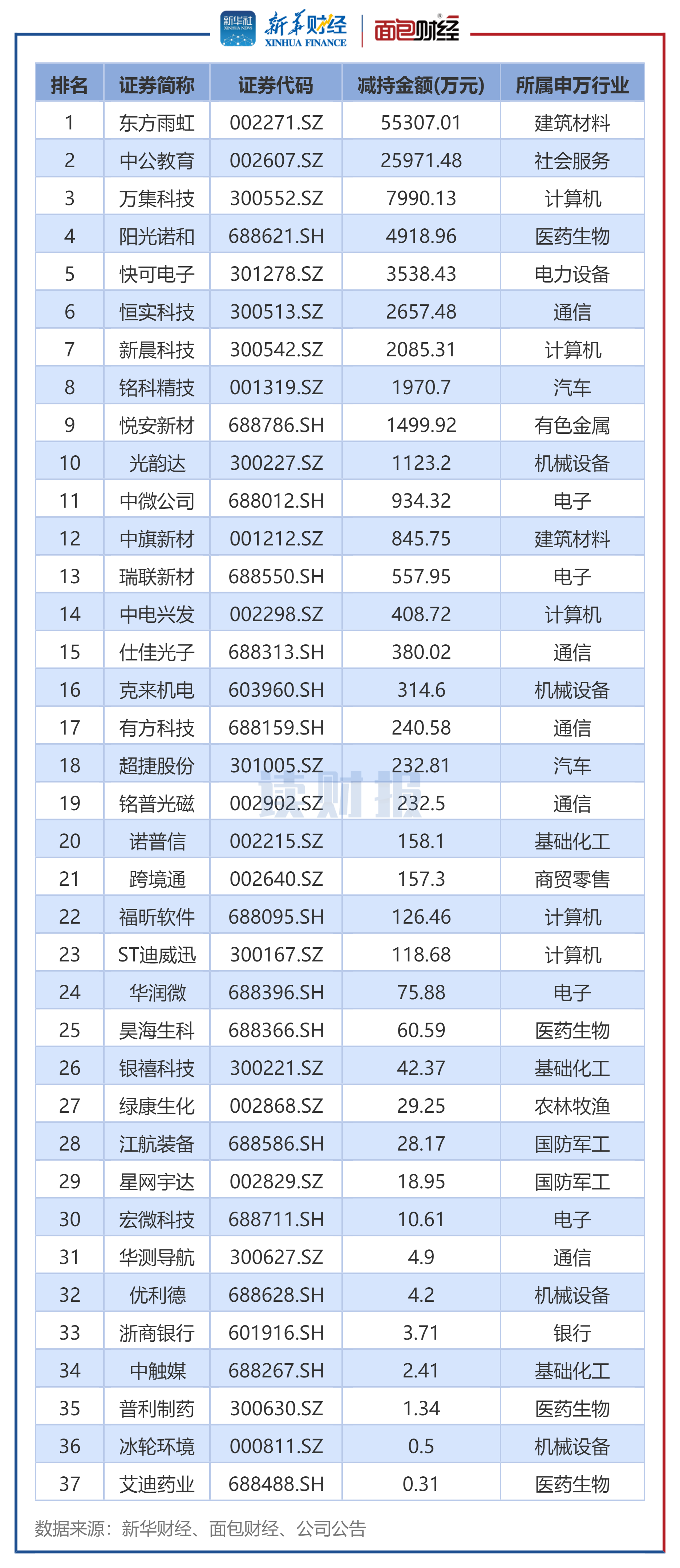 中公教育减持金额排在第二位,该公司董事王振东通过大宗交易的方式合计减持9352.4万股,减持金额约2.6亿元。