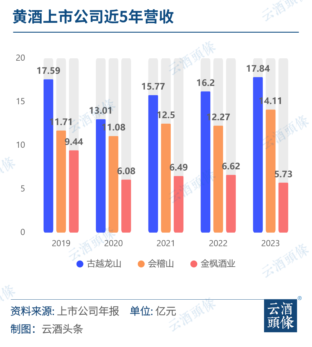 由于受到酒业短周期调整影响,黄酒龙头古越龙山此前业绩下滑较为明显,其2023年17.84亿元的营收,恰好使业绩回暖至2019年水平。