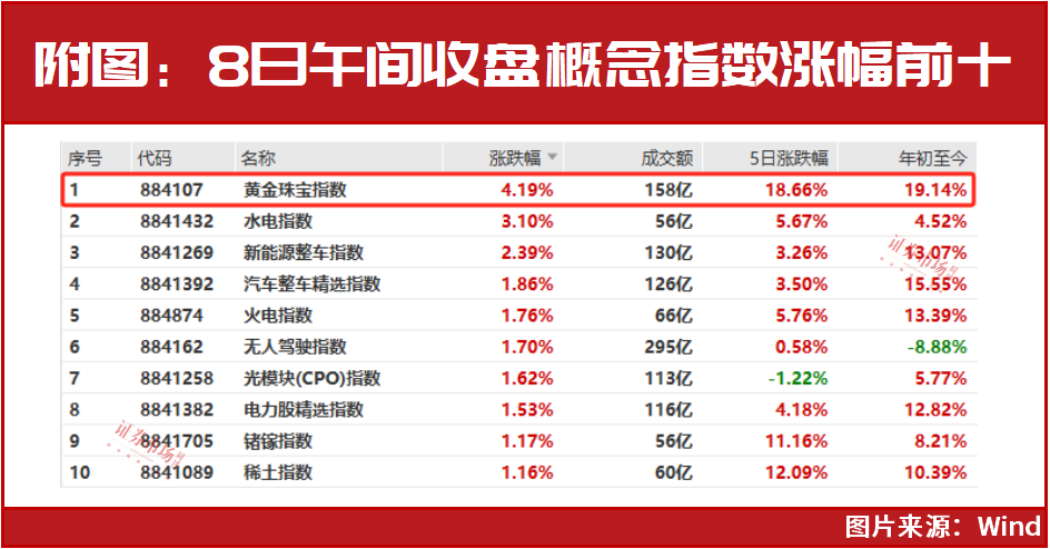在股票市场,大家对黄金股有着同样的疯狂。如多只黄金相关的ETF在8日午间收盘再次创下历史新高,黄金珠宝指数则大涨4.19%,在Wind300余个概念板块中位列涨幅榜第一。此外,连带着锗镓等稀有贵金属同样表现强劲(见附图)。其中,莱绅通灵再度收出“一字”涨停,这已是公司第5个连续涨停板,恒邦股份、豫光金铅、山东黄金等跟涨。