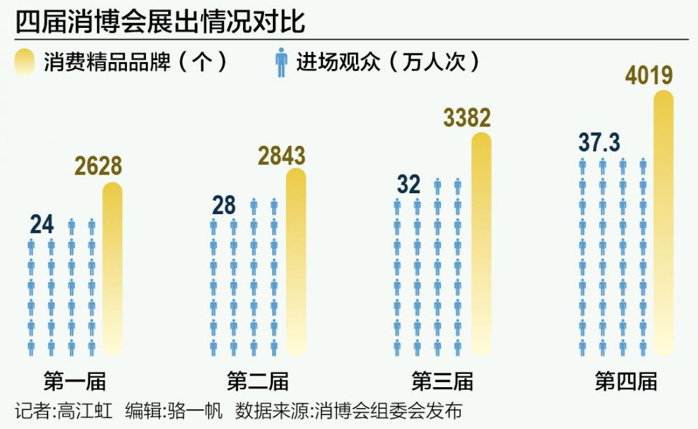 从展会成绩上看,年仅四岁的消博会进步迅猛,展会面积越来越大,对国内外品牌的吸引力也越来越强。组委会的数据显示,第一届消博会的共计来自69个国家和地区1505家企业,2628个消费精品品牌参展。各类采购商和专业观众数量超过3万人,进场观众超过24万人次。当时国际品牌举办了83场新品发布会,各省区市举办了10场地方精品推介会,共发布新品超过550个。可以说,从参展国家、企业、品牌等数量,到采购商和专业观众、进场观众数量,以及新品发布数量等,消博会都较当初有了显著的提升。