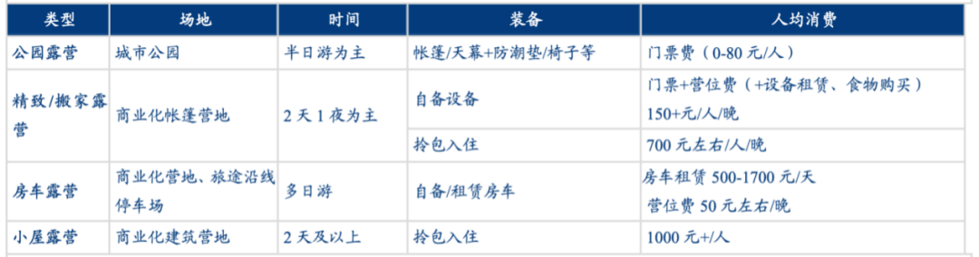露营地消费门槛相对较低,人均消费150-200 元/天。从目前市场发展来看,系统化、标准化、规模较大的露营地有途居露营、乐营国际营地、山隐西江、嗨king等等。途居露营主要针对房车露营地,嗨king更多在景区、特色小镇等开辟特色营地。途居房车露营地每晚售价在300-500元不等;还有的品牌营地可“拎包入住”,套餐在399-799元不等。