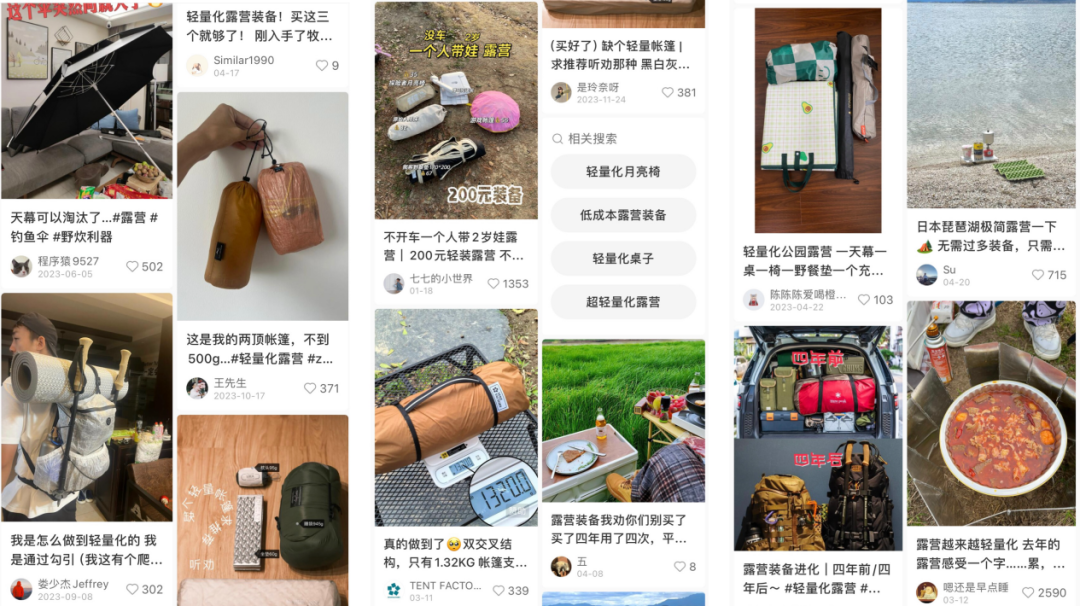 精致露营虽然需要系统性装备支撑,而在装备的选择上,也掀起了一股轻量化风,人们不再追求多而全,而是追求必需和一物多用。