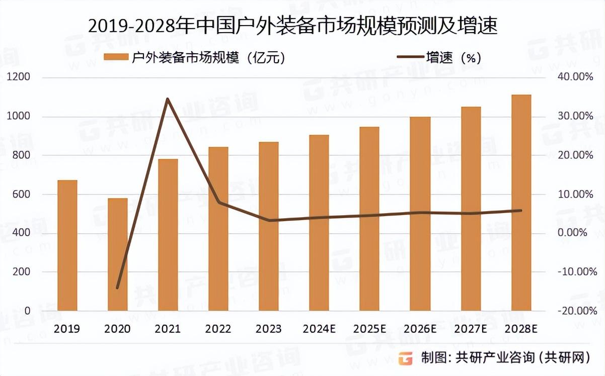 根据共研网数据,2023年中国户外装备市场规模为872亿元,2023-2028年中国户外装备市场规模的CAGR为5%;预计2028年户外装备市场规模有望突破千亿元,达到1113亿元。