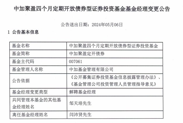 记者还注意到,闫沛贤于5月6日卸任了中加聚盈四个月定期开放债券型证券投资基金,离任理由也是工作需要,中加聚盈规模只有0.19亿元。