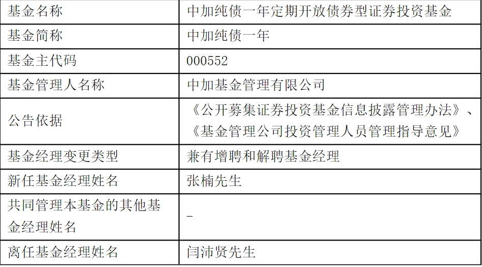 5月9日,中加纯债一年定期开放债券型证券投资基金(以下简称“中加纯债一年”)发布基金经理变更公告,张楠接任基金经理,闫沛贤因工作需要离任。