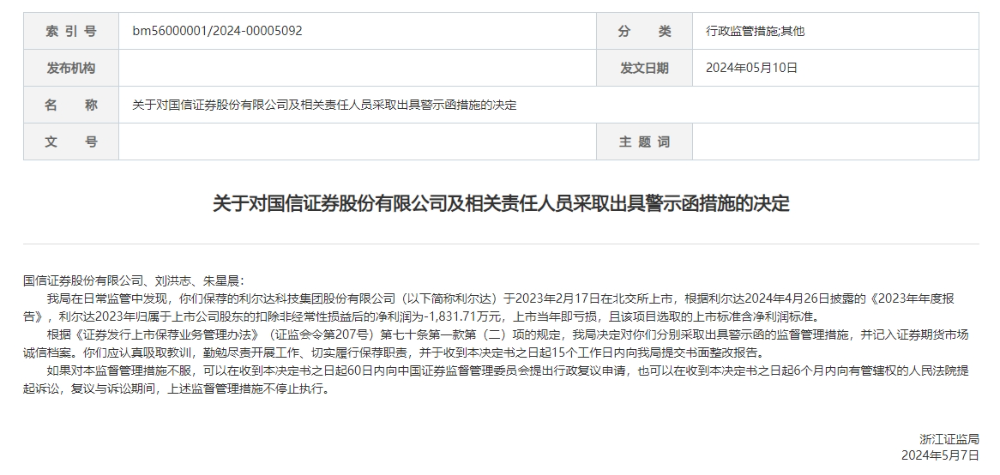5月10日,浙江证监局发布对利尔达(832149.BJ)、国信证券(002736.SZ)采取出具警示函措施的决定。