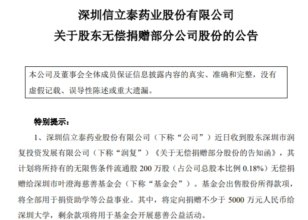 5月13日,信立泰发布《关于股东无偿捐赠部分公司股份的公告》,公告显示,股东深圳市润复投资发展有限公司(下称“润复”)拟将所持有的无限售条件流通股200万股无偿捐赠给深圳市叶澄海慈善基金会(下称“基金会”)。据介绍,润复由公司实际控制人之一陈志明控股。