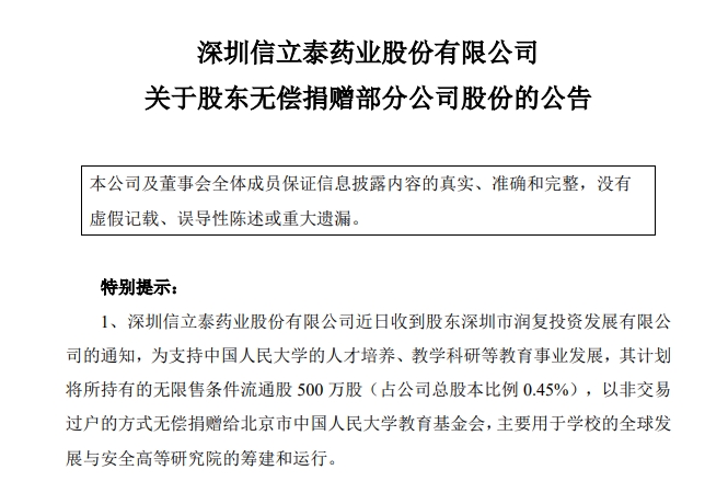 1月15日,信立泰发布公告,润复捐赠500万股给北京市中国人民大学教育基金会,支持中国人民大学的人才培养、教学科研等教育事业发展,捐赠资金主要用于该学校的全球发展与安全高等研究院的筹建和运行。