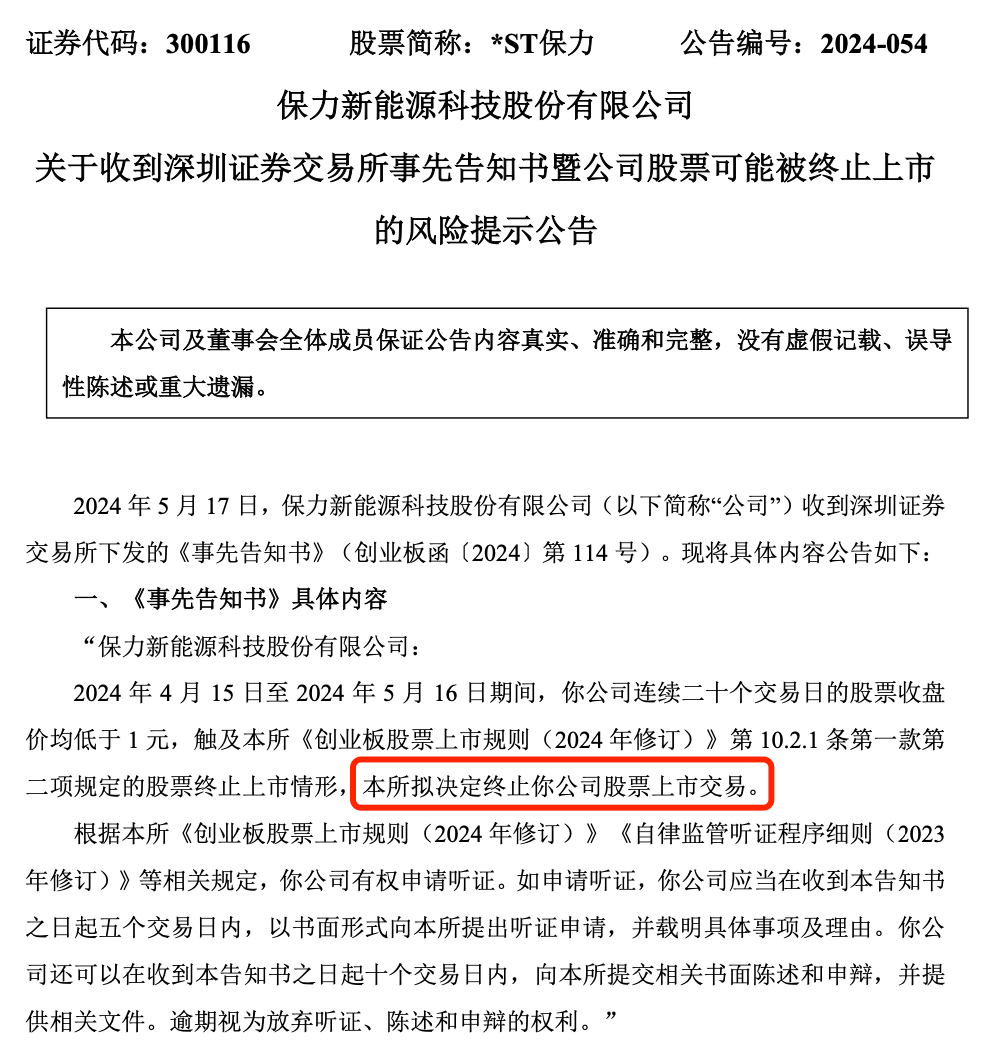 5月17日晚间,*ST保力公告,公司收到深交所下发的《事先告知书》。4月15日至16日,公司连续20个交易日的股票收盘价均低于1元,深交所拟决定终止公司股票上市交易。