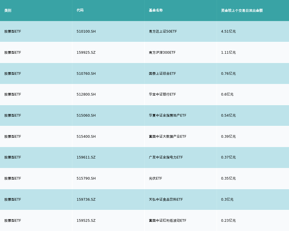 昨日股票型ETF资金流出最多的3支ETF及其流入金额分别为:易方达上证50ETF(流出4.51亿元)、南方沪深300ETF(流出1.11亿元)、国泰上证综合ETF(流出0.76亿元)。资金流出前10详情见下表:
