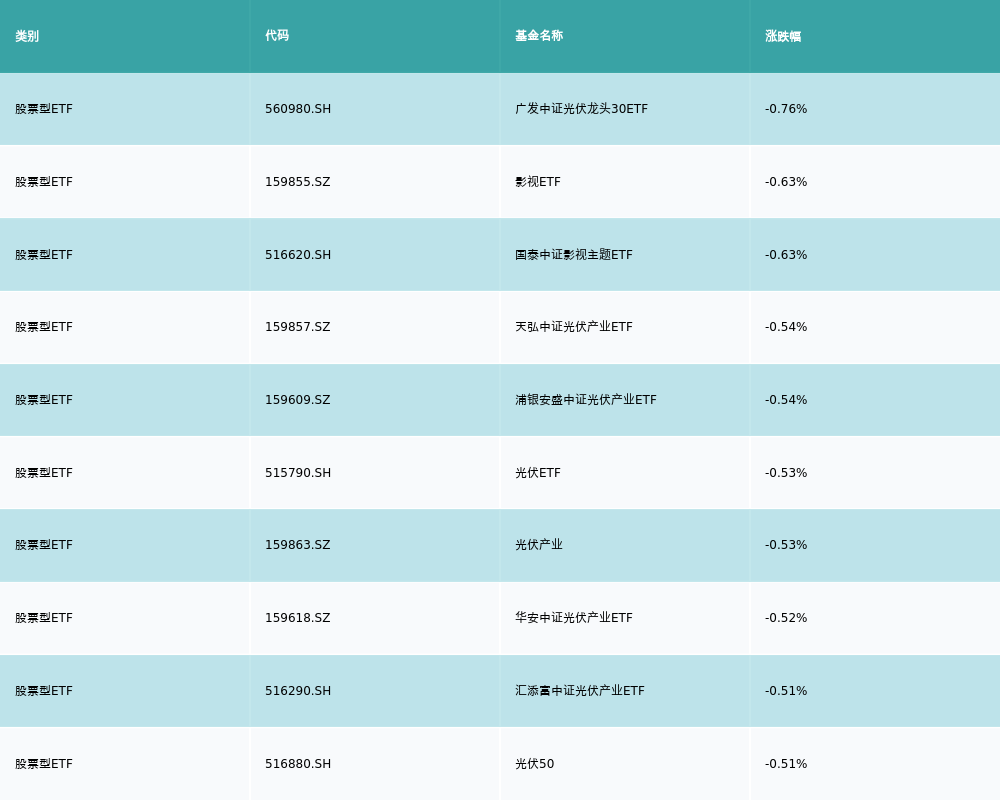 昨日股票型ETF跌幅最大的3支ETF及其收益率分别为:广发中证光伏龙头30ETF(-0.76%)、影视ETF(-0.63%)、国泰中证影视主题ETF(-0.63%)。跌幅前10详情见下表: