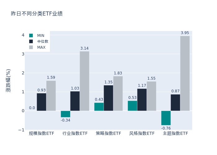 昨日股票型ETF收益率中位数为0.95%。其中按照不同分类,规模指数中易方达上证科创板50ETF收益率最高,为1.59%;行业指数中国泰中证全指集成电路ETF收益率最高,为3.14%;策略指数中南方富时中国国企开放共赢ETF收益率最高,为1.83%;风格指数中富国中证价值ETF收益率最高,为1.55%;主题指数中招商中证半导体产业ETF收益率最高,为3.95%。