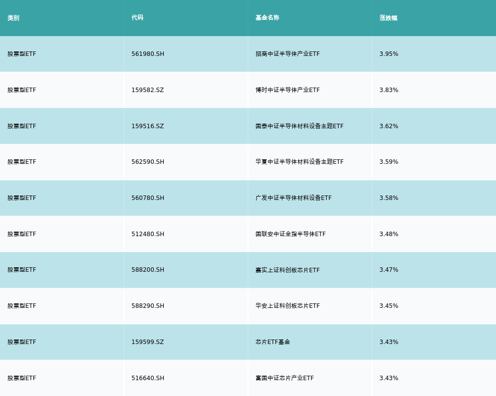 昨日股票型ETF涨幅最高的3支ETF及其收益率分别为:招商中证半导体产业ETF(3.95%)、博时中证半导体产业ETF(3.83%)、国泰中证半导体材料设备主题ETF(3.62%)。涨幅前10详情见下表: