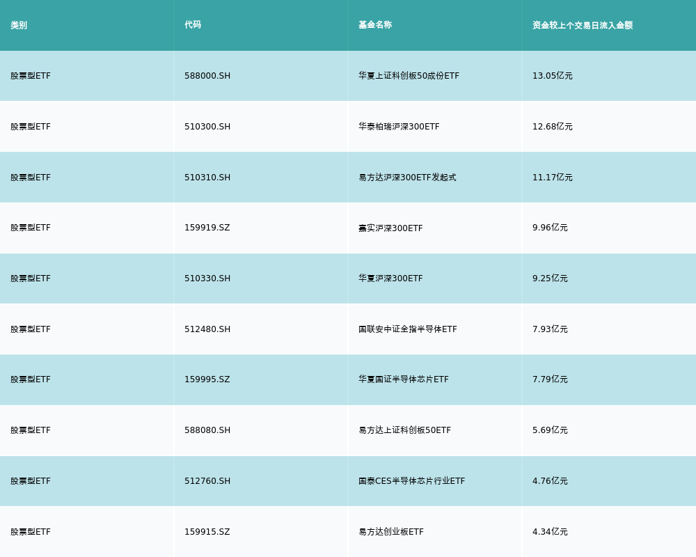昨日股票型ETF资金流入最多的3支ETF及其流入金额分别为:华夏上证科创板50成份ETF(流入13.05亿元)、华泰柏瑞沪深300ETF(流入12.68亿元)、易方达沪深300ETF发起式(流入11.17亿元)。资金流入前10详情见下表: