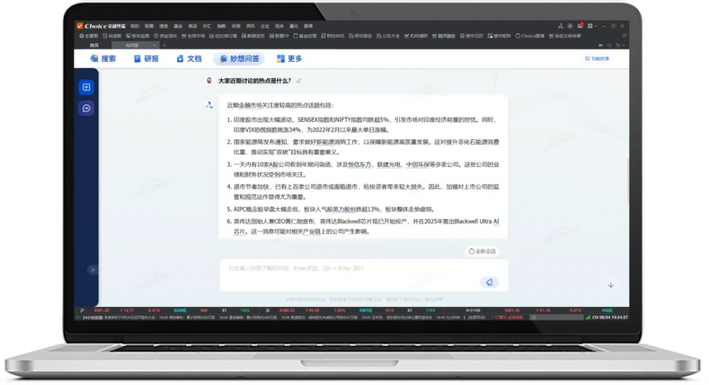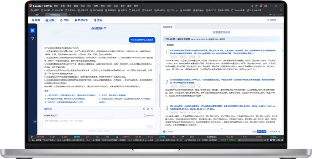 Choice数据和妙想大模型厚积薄发带来的DATA+AI的深度融合,也为Choice智能金融终端的数据和信息管理带来焕新升级。在信息处理层面,Choice智能金融终端深耕金融专业术语,确保搜索精准定位从源头上消除杂音,通过清洗、筛查、过滤、定位、提炼等智能化信息处理能力,完成信息溯源、数据定位、要点总结、问答交互,助力用户穿越信息红海,捕捉可靠的信源。在信息交互层面,Choice智能金融终端引入自然语言交互的智能方式,与Choice既有的数据表单窗口提取方式互为支撑,拓展了Choice智能金融终端的边界和外延。在数据治理层面,大模型和大数据技术在Choice智能金融终端完成智慧融合,进一步巩固了平台对数据安全、数据清洗、信息备份等数据要素的综合建设能力和立体管理效率。