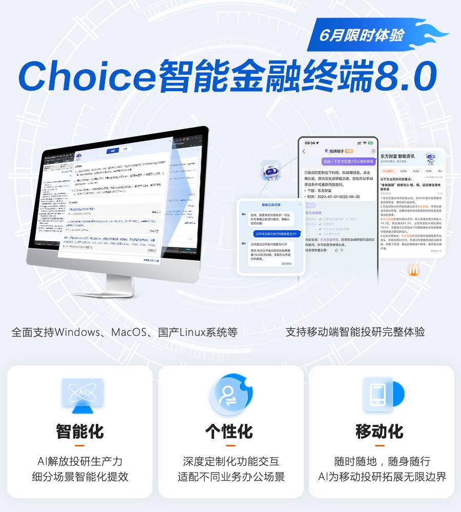 据悉,东方财富Choice此次发布的七大智能场景同步上线了PC端8.0版本和APP端8.0版本,全面覆盖支持Windows、Mac OS、国产Linux等多种操作系统,适配用户智能办公、移动投研场景,实现零成本场景切换,通过多平台+多系统覆盖提供无边界智能交互。据了解,此次问世的Choice智能金融终端8.0版本面向终端用户已开通限时体验通道。