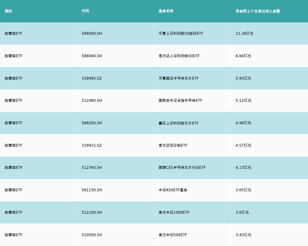 昨日股票型ETF资金流入最多的3支ETF及其流入金额分别为:华夏上证科创板50成份ETF(流入21.26亿元)、易方达上证科创板50ETF(流入8.84亿元)、华夏国证半导体芯片ETF(流入5.93亿元)。资金流入前10详情见下表:
