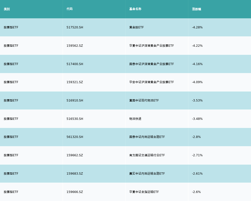 昨日股票型ETF跌幅最大的3支ETF及其收益率分别为:黄金股ETF(-4.28%)、华夏中证沪深港黄金产业股票ETF(-4.22%)、国泰中证沪深港黄金产业股票ETF(-4.16%)。跌幅前10详情见下表: