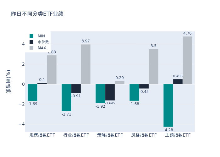 昨日股票型ETF收益率中位数为0.05%。其中按照不同分类,规模指数中华夏上证科创板100ETF收益率最高,为2.88%;行业指数中国泰中证全指集成电路ETF收益率最高,为3.97%;策略指数中华夏创业板低波价值ETF收益率最高,为0.29%;风格指数中易方达上证科创板成长ETF收益率最高,为3.5%;主题指数中嘉实上证科创板芯片ETF收益率最高,为4.76%。