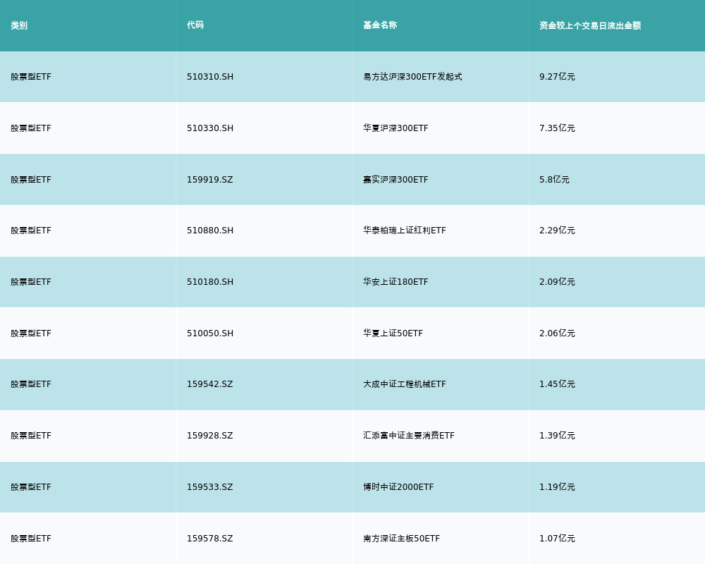 昨日股票型ETF资金流出最多的3支ETF及其流入金额分别为:易方达沪深300ETF发起式(流出9.27亿元)、华夏沪深300ETF(流出7.35亿元)、嘉实沪深300ETF(流出5.8亿元)。资金流出前10详情见下表: