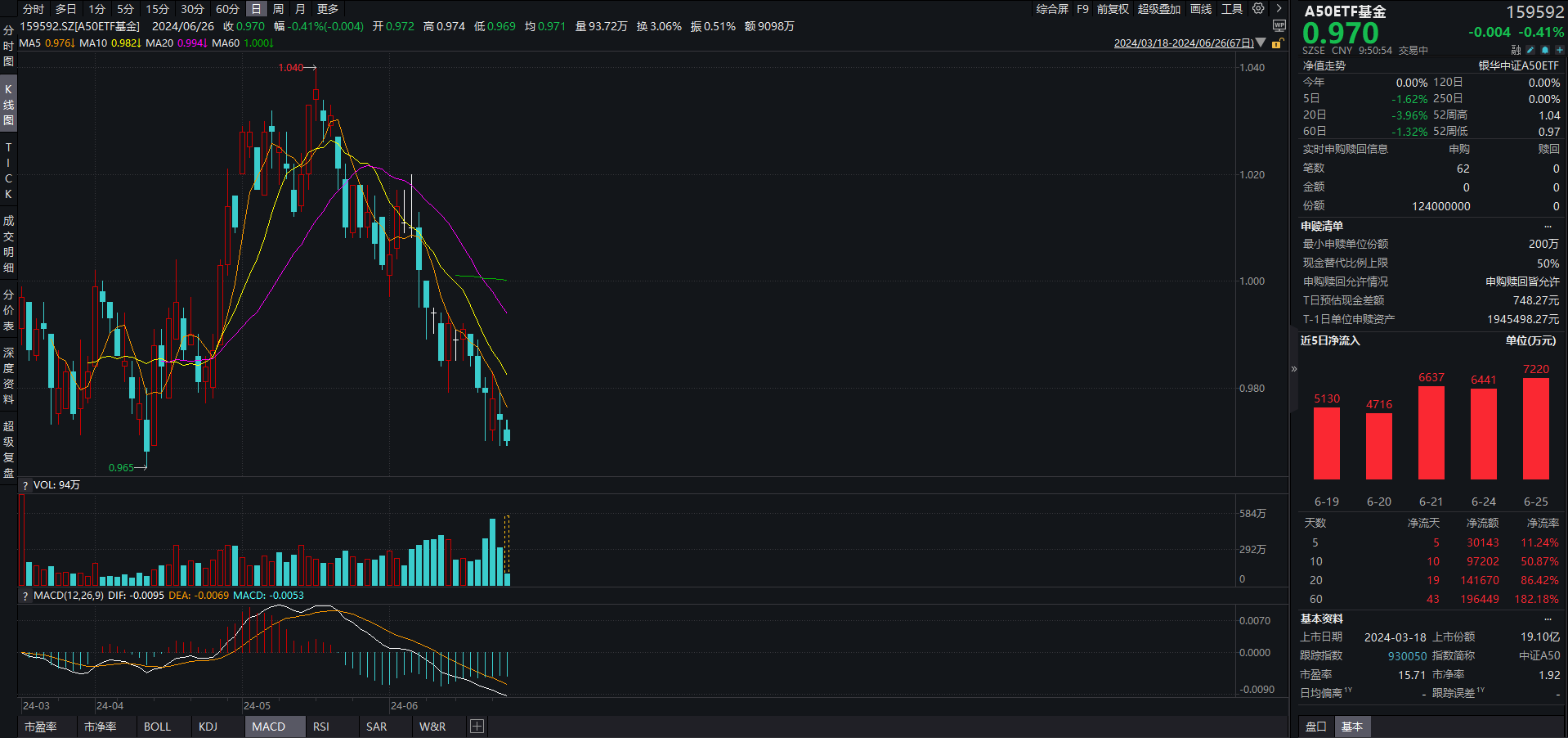 相关ETF中,A50ETF基金(159592)跌0.41%,盘中交投活跃,成交额已超7000万元,换手率达2.36%,溢折率为0.09%。