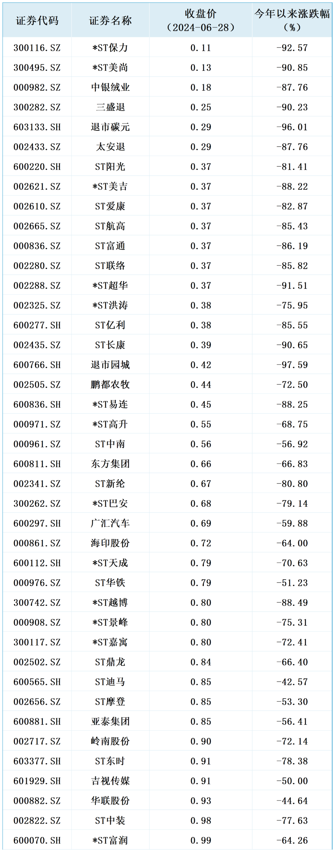 根据交易规则,当上市公司股价连续20个交易日低于面值1元时,会被强制退市,即俗称的“面值退”,值得注意的是面值退市是没有退市整理期的,目前股价低于1元的上市公司需要重点警惕,如下: