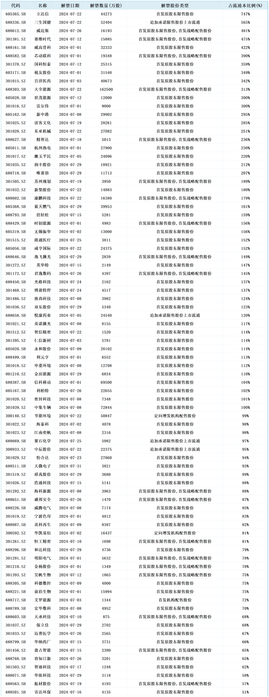 2024年7月,沪深两市共有317只个股存在限售解禁,解禁股本占流通股本比例超过50%的如下: