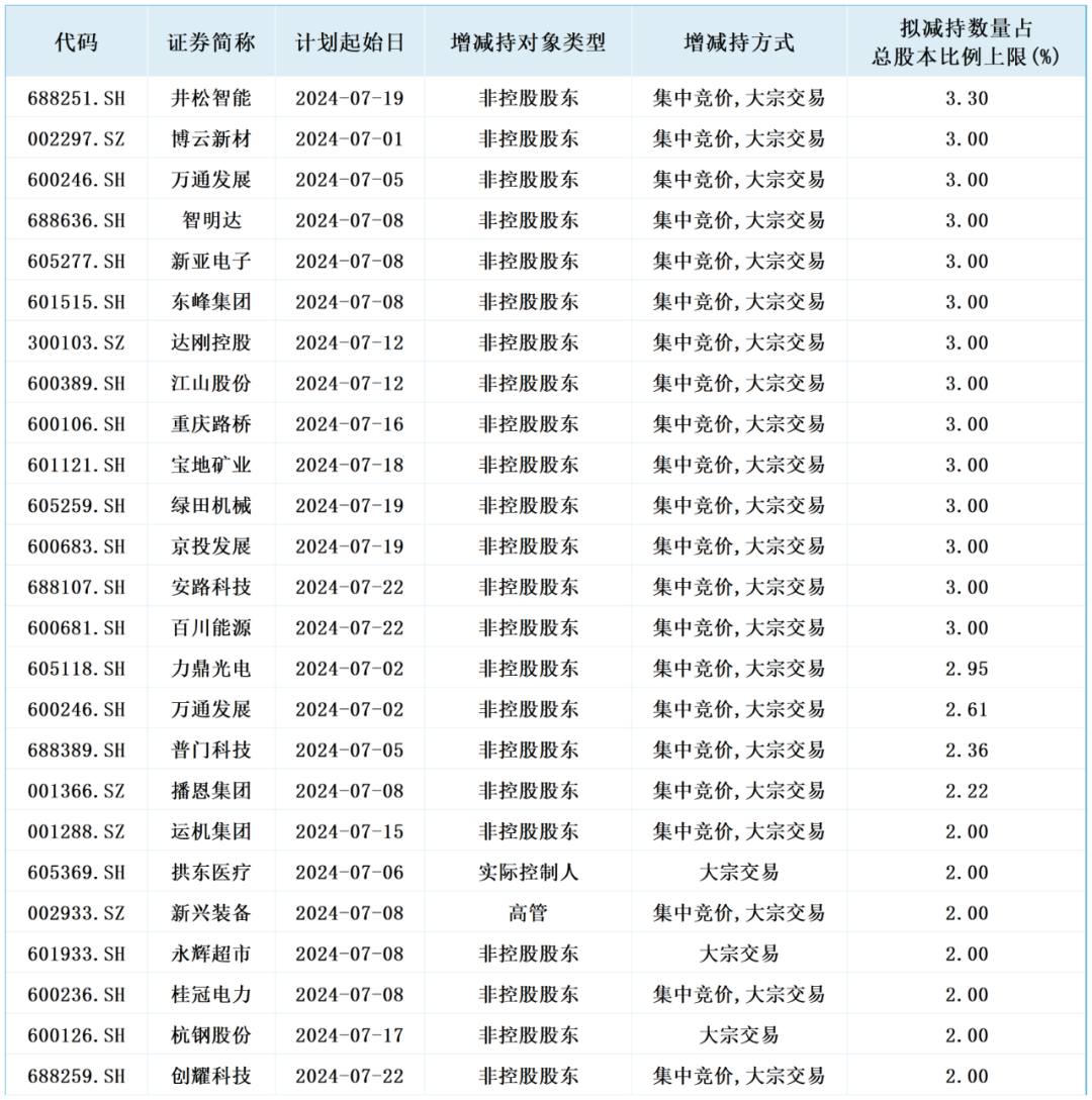 根据上市公司公告披露的减持计划,2024年7月,上市公司拟计划减持数量占总股本比例上限超过(含)2%的公司如下: