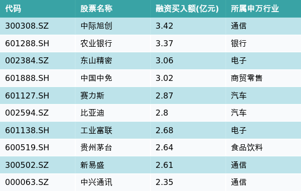 7月4日,两市共有3310只个股有融资资金买入,其中中际旭创、农业银行、东山精密排名前三,买入金额分别3.42亿元、3.37亿元、3.06亿元。融资买入额前10个股详情见下表: