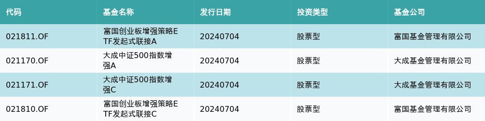 7月4日有4只新基金发行,分别为:富国创业板增强策略ETF发起式联接A、大成中证500指数增强A、大成中证500指数增强C、富国创业板增强策略ETF发起式联接C,详情见下表: