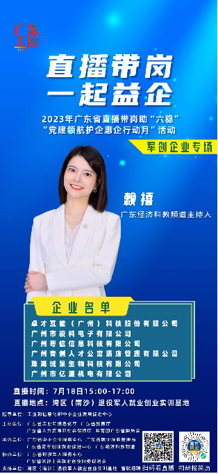 2023年广东省直播带岗助“六稳”活动由工业和信息化部中小企业发展促进中心指导,广东省工业和信息化厅、广东省教育厅、广东省人力资源和社会保障厅及共青团广东省委员会共同主办,广东省中小企业服务中心、广东省就业服务管理局、广东省青年创业就业促进中心以及广东经济科教频道共同承办。
