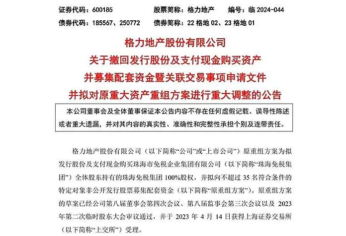 格力地产称,鉴于原重组方案推进时间较长,环境发生较大变化,决定撤回原方案。