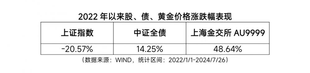(数据来源:WIND,测算区间:2014/1/1-2024/7/26。参考公式:100%股票/债券/黄金收益=前一日本金收益和*(1+指数当日涨跌幅),“40%股票+30%债券+30%黄金”组合收益=股票收益*40%+债券收益*30%+黄金收益*30%,收益率=(收益-本金)/本金。以上收益仅为模拟测算数据,不预示未来表现。市场有风险,投资需谨慎。)可以看到,与100%投资股票相比,“40%股票+30%债券+30%黄金”组合的波动要明显小得多;而与100%投资债券相比,“40%股票+30%债券+30%黄金”组合更具收益弹性,且长期来看,“40%股票+30%债券+30%黄金”组合收益大幅跑赢100%股票、100%债券投资的收益。也就是说,在投资组合中加入黄金资产,不仅有望降低组合整体波动,也能拓宽收益来源,有效提升组合的风险收益性价比。
