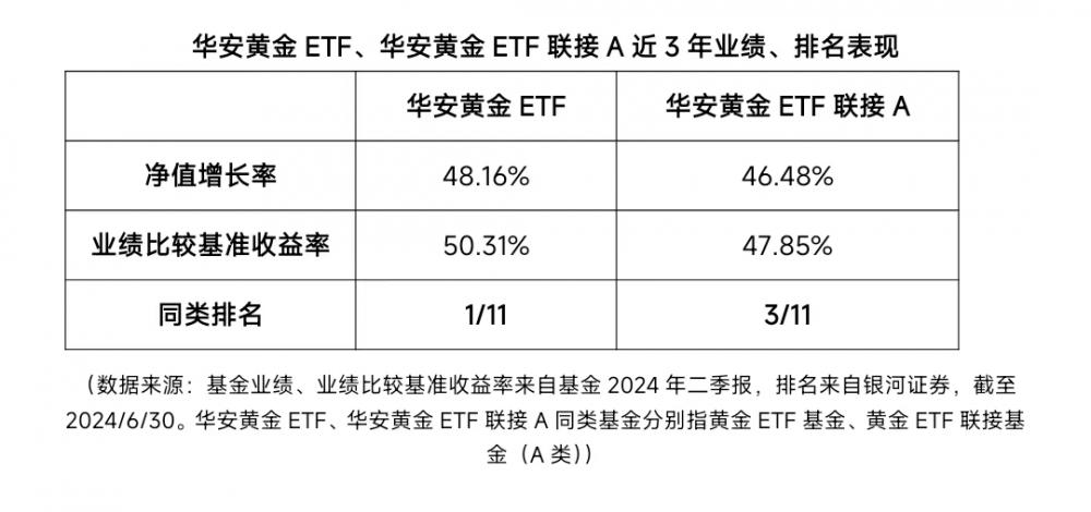 从过往表现看,华安黄金ETF、华安黄金ETF联接A近3年净值增长率都超过了45%,且都在同类产品中排名靠前,其中,华安黄金ETF位列同类第1,领先优势显著。