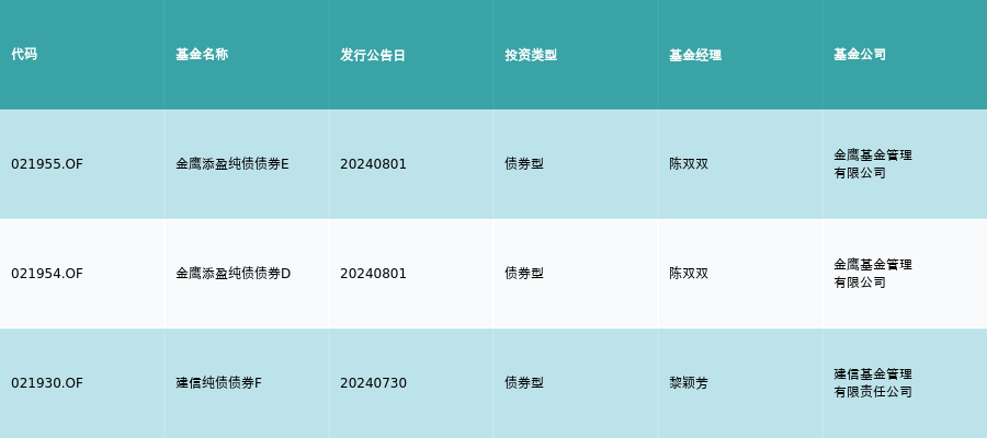 上周有3只新基金发行,分别为:金鹰添盈纯债债券E、金鹰添盈纯债债券D、建信纯债债券F,详情见下表: