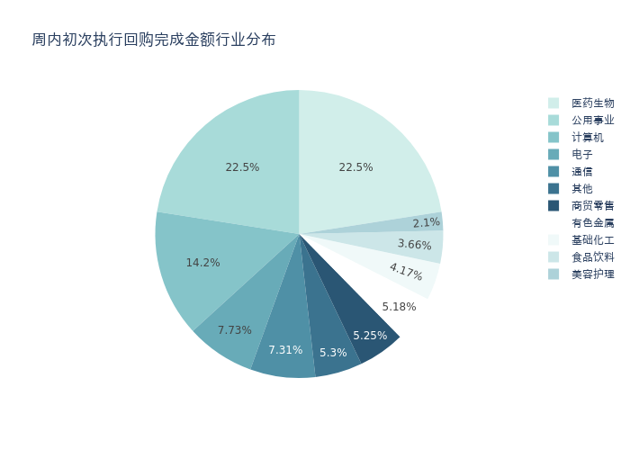 按照初次执行金额所在不同行业分布,金额最高的3个行业分别为:医药生物、公用事业、计算机,详情见下图: