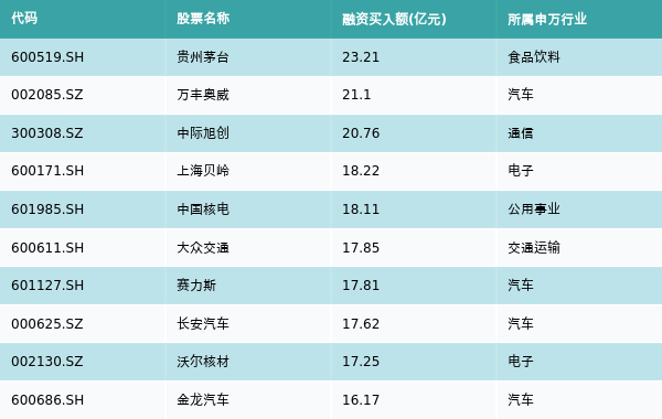 上周两市共有3355只个股有融资资金买入,共有28只个股买入金额超10亿元,其中贵州茅台、万丰奥威、中际旭创排名前三,买入金额分别23.21亿元、21.1亿元、20.76亿元。融资买入额前10个股详情见下表: